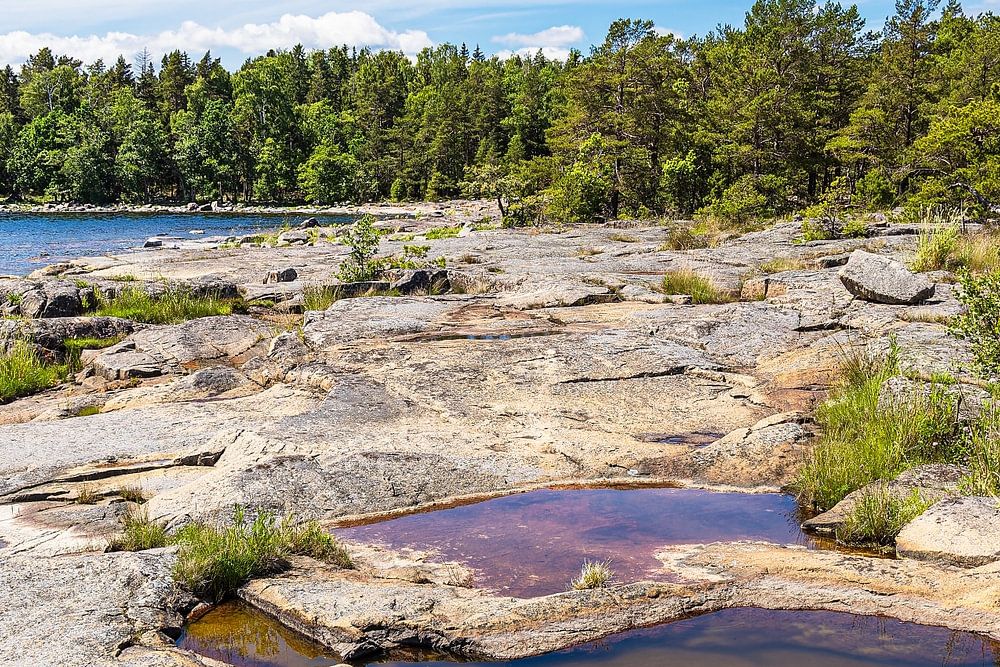 Baltic Sea coast with rocks and trees on the island of Sladö in Sweden.