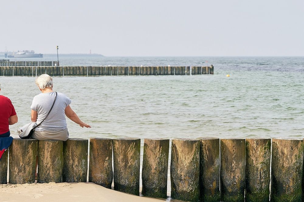 two elderly female vacationers take a break from walking on the beach and sit on a breakwater on the beach of Kolobrzeg on the Polish Baltic coast. The Polish Baltic coast is a popular destination for vacationers from all over the world.