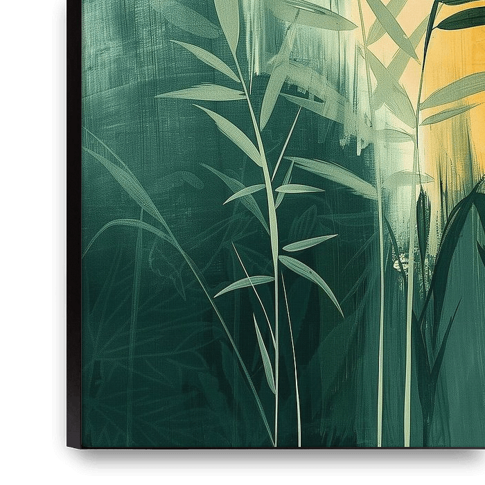 Slender bamboo branches stretch gracefully upwards against a layered background of green and warm yellow. The composition is vertically structured, with the left side dominated by deep green tones that slowly fade into a soft, almost sun-drenched yellow on the right. This subtle colour gradient creates a sense of light and space, as if…