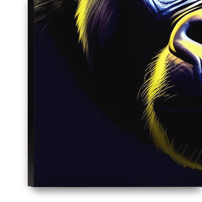 Imagine an intriguing artwork where a majestic chimpanzee comes to life on a deep black background, accented by bold strokes of bright yellow. The black background symbolises the mysterious depths of the jungle, while the yellow paint strokes exude a powerful energy.