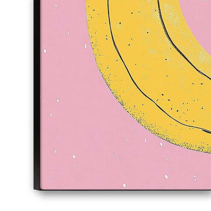 A banana, Risograph print with a grainy texture, a simple flat illustration in a vector art style, on a pink background, printed with Risograph ink.