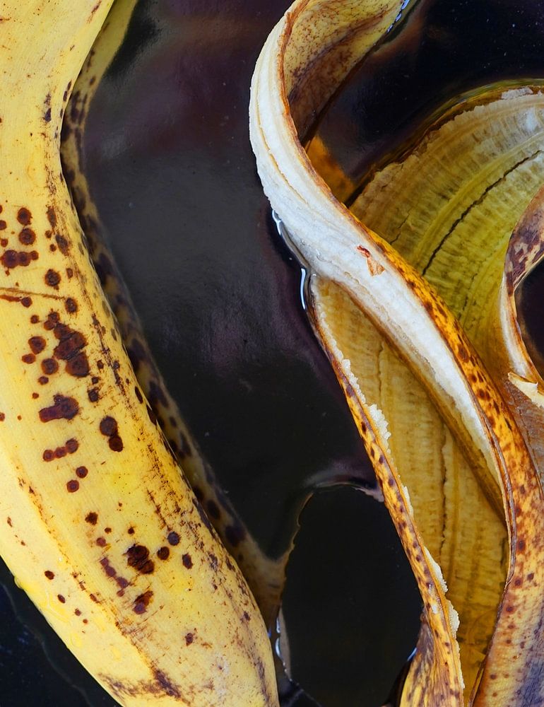 Bananas are beautiful, funny fruits because of their colour and shape. Even the peeled still is decorative, especially when they are draped like this in this bowl, whose edges immediately frame the picture.