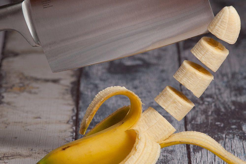 A delicious banana chopped. The pieces seem to float.