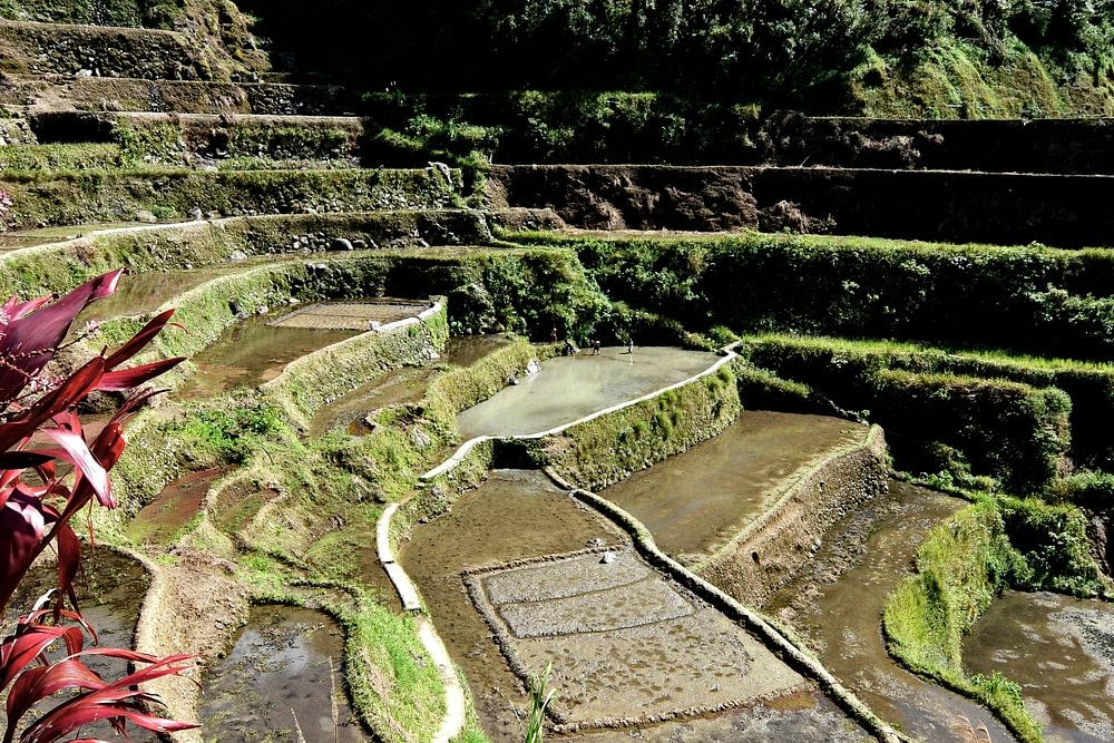 In the heart of the Philippines, the Banaue rice terraces reveal a breathtaking landscape, listed as a UNESCO World Heritage Site. This masterpiece of mountain farming, built by the Ifugao people over 2,000 years ago, offers a captivating view dominated by shades of green. In the foreground, bright red plants add a striking touch to this already majestic scene. These bursts of colour contrast with the harmonious slopes of the rice fields, creating a vibrant, living canvas.
