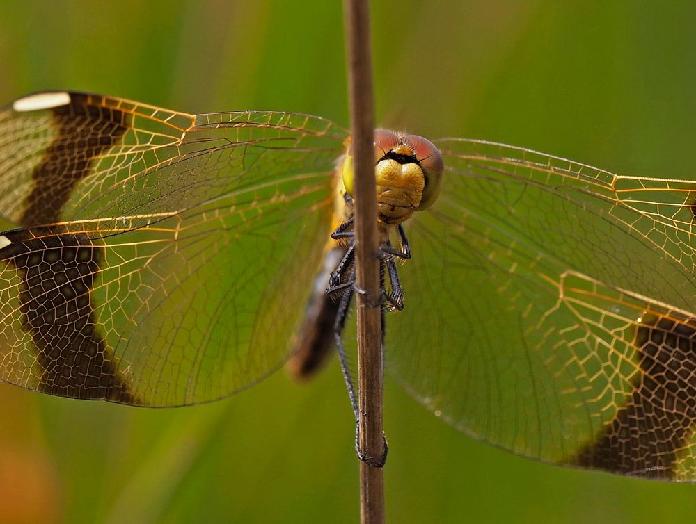 Bandheidelibel vrouwtje in de ochtendzon aan het opwarmen