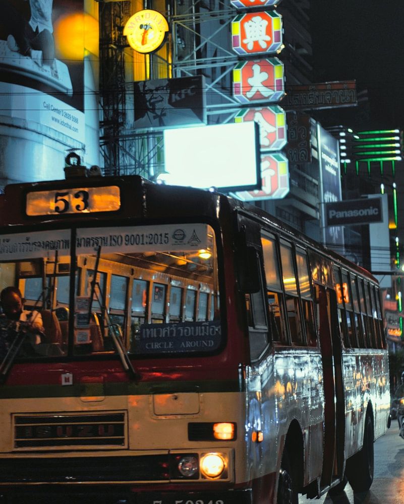 The nightlife never stops in Bangkok. There is so much to see and, for a photographer, the ultimate luck to be able to walk around. This photo was taken at China Town. Here you can eat fantastic food and try to process all the stimuli as it is very busy with traffic and food stalls. Public transportation is diverse and these buses are an easy and inexpensive way to admire city life.