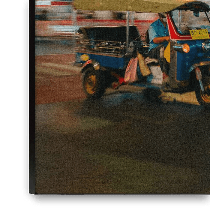 The picture shows a classic tuk-tuk travelling rapidly through Bangkok at night, depicted with vivid motion blur. The colourful vehicle paintwork and the bright illumination of the Asian street signs in the background embody the vibrant life and energy of the metropolis. This motif symbolises urbanity, adventure and the unique Thai…