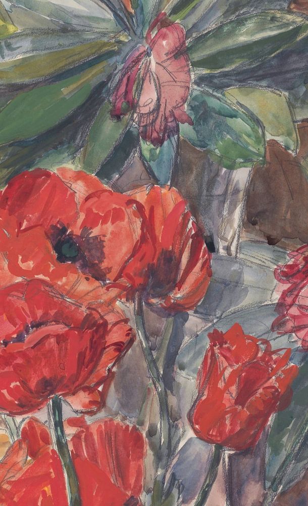 Still life with flowers in red and green. among others, the poppy or poppy is in the painting.