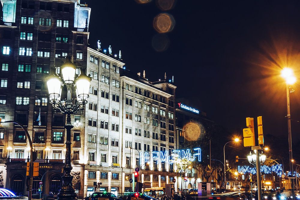 Barcelona in the rain: A night shot of the Passeig de Gràcia avenue.