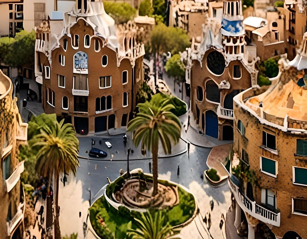 An aerial view of a vibrant cityscape showcases unique architecture with swirling roofs and mosaic details. Plazas with lush palm trees are interspersed among the buildings, and a prominent statue can be seen in the background on a hill overlooking the city.