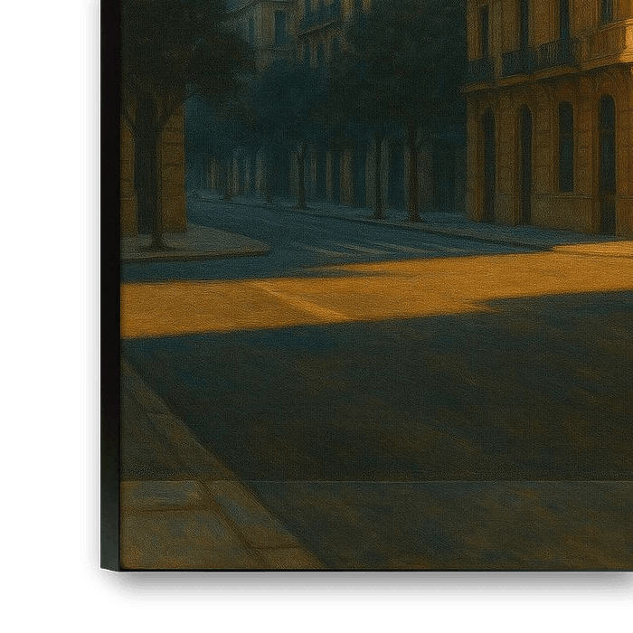 Barcelona Sunset Serenity captures the hush that falls over the Eixample district when the sun lowers and the geometry of the city glows. Long shadows spill between tree-lined avenues, brushing the façades of stately buildings with liquid gold. The artist, inspired by Edward Hopper’s quiet lyricism and his fascination with light’s emotional weight, translates Barcelona’s architecture into a theatre of calm.