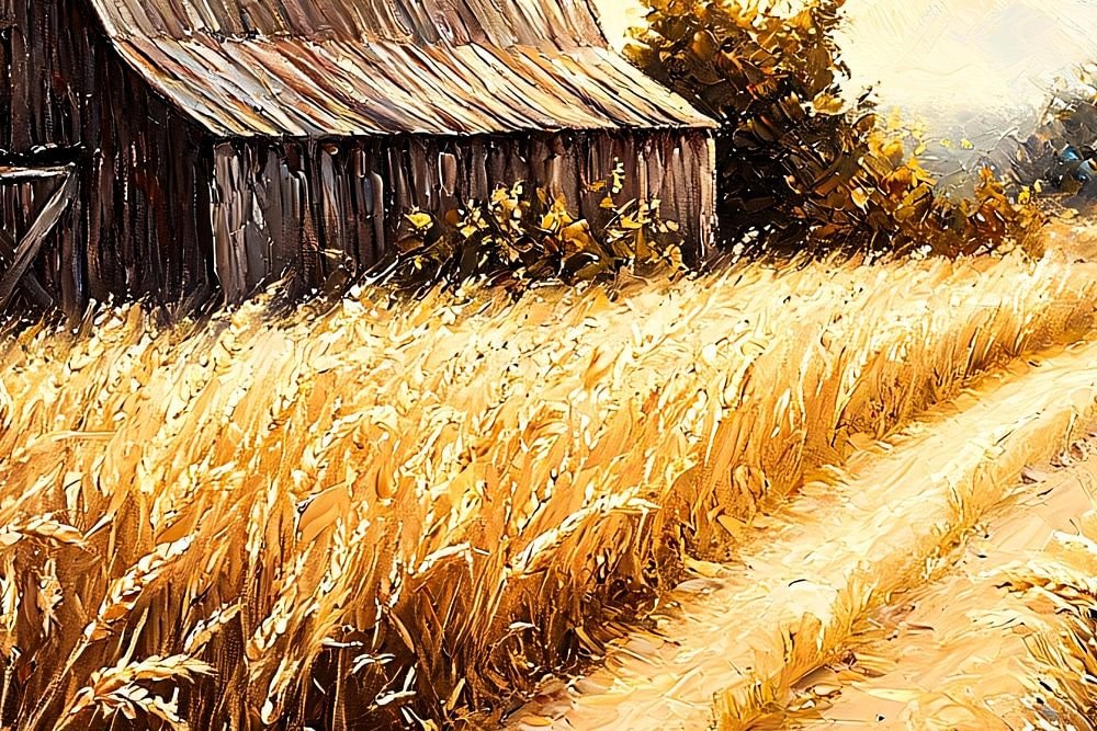 This beautiful design depicts a rustic scene of an old wooden barn nestled in a golden wheat field. The warm, earthy colours and soft brushstrokes create a nostalgic and serene look, perfect for bringing a sense of warmth and comfort into your home. The design exudes rural charm and brings the tranquillity of the countryside to your interior. An ideal artwork to create atmosphere in a living room or dining room.