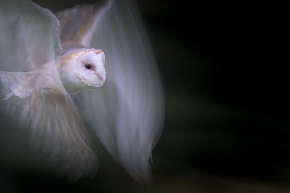 This barn owl flies through the air at full speed. The slow shutter speed makes the movement of the wings clearly visible.