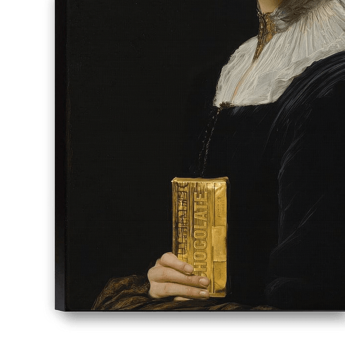 A humorous artwork depicting a Baroque lady with a golden chocolate bar in the style of the old masters, with a modern twist that feels elegant and slightly ironic. The combination of classical portrait techniques and a contemporary object creates a charming scene that both evokes a smile and adds sophistication.