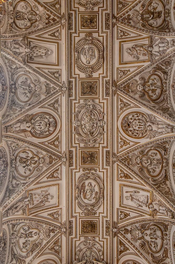 This picture shows the ornate vaulted ceiling of the cathedral of the Great Mosque of Córdoba, one of the most important buildings in Andalusia. The historic architecture combines baroque design elements with Moorish influence and documents the cultural depth of this unique building. The vault is richly decorated with frescoes, stucco work and ornamental reliefs depicting floral and religious motifs. The symmetrical composition of the vaulted structure and the central window opening create a balanced play of light that impressively emphasises the staggered heights and spatial depth of the interior. Part of the baroque altar can be seen in the lower area, decorated with a statue of a saint and golden applications that emphasise the spiritual significance of the place. The colour palette of ivory, gold and warm sandstone lends the scene a solemn atmosphere. The combination of light, structure and material aesthetics makes the picture an expressive testimony to sacred architecture. It particularly appeals to art lovers, architecture enthusiasts and lovers of religious symbolism. The Mezquita Cathedral is considered an architectural landmark in Spain and combines Islamic and Christian elements in a unique spatial composition, which this photo conveys in a visually impressive way.