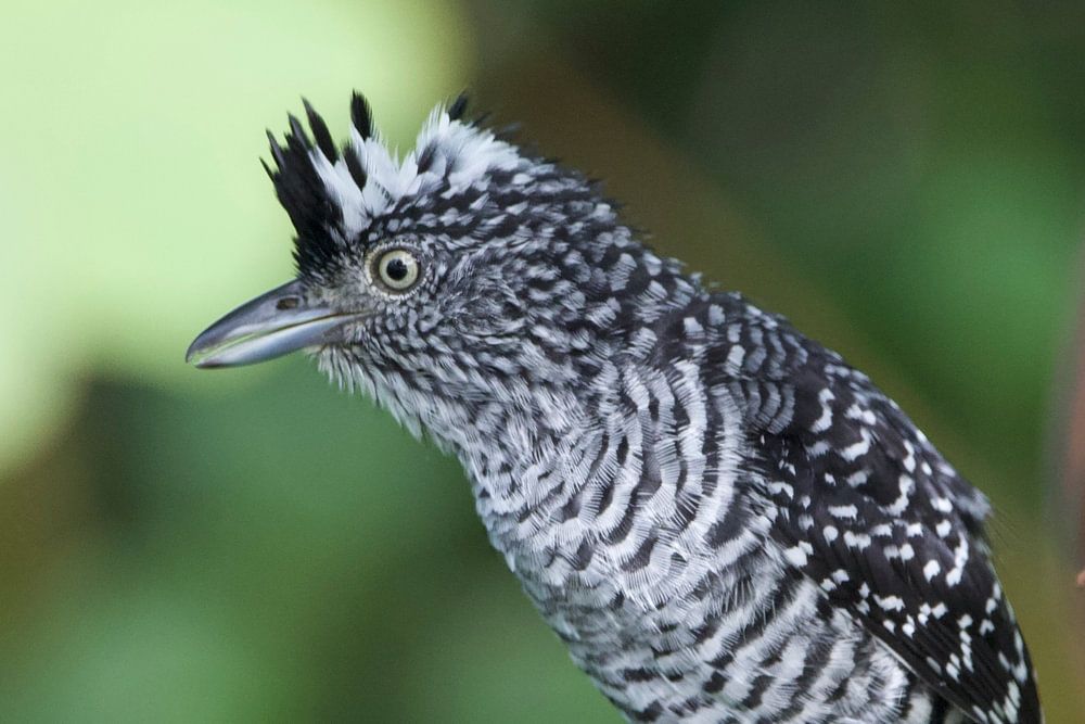 The barred antshrike immediately stands out for its strong black and white markings. The stripes run tightly across breast and flanks, giving the bird a bright graphic pattern. The male is more contrasting than the female: deep black is interspersed with bright white, keeping him highly visible even in shady vegetation.