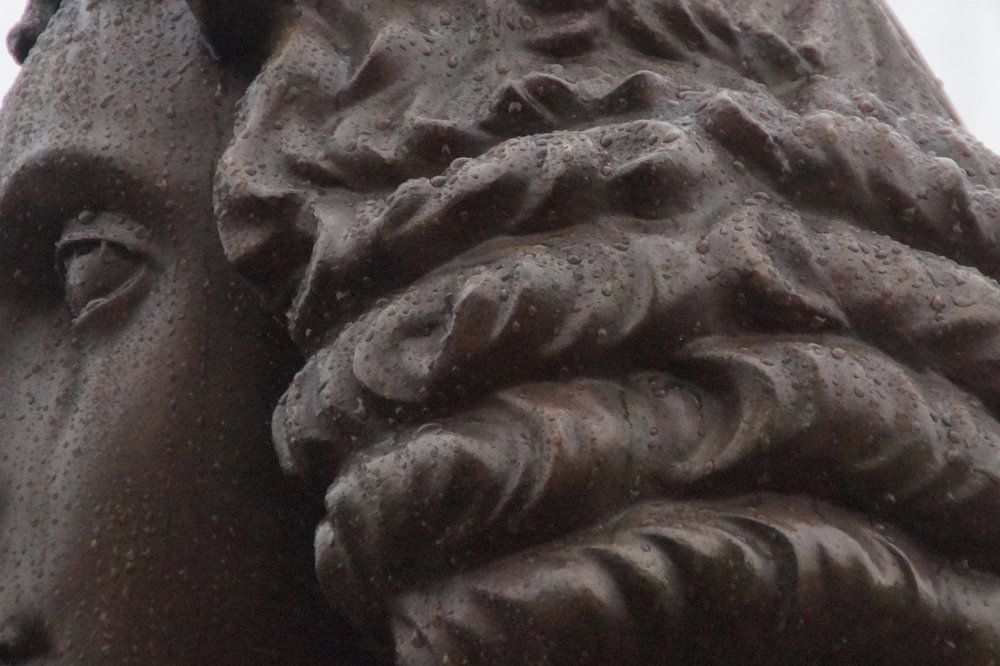Het gezicht van Spinoza, bronzen beeld in Amsterdam. De foto is gemaakt op een regenachtige dag, vandaar de waterdruppels op het gezicht van Spinoza.