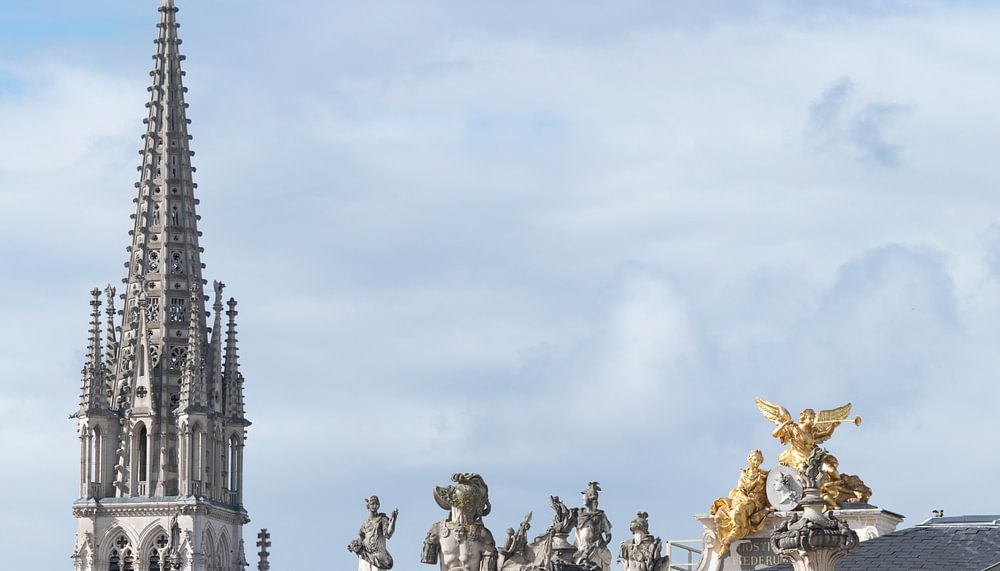 Nancy France Spire of Basilica of Saint Epvre of Nancy seen from Place Stanislas.Basilique Saint-Epvre. Stitched panoramaChurch, eglise, spire, blue, skies,