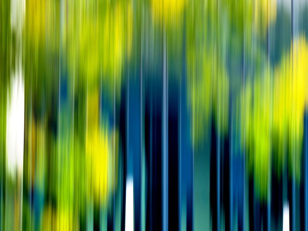 This image captures a modern, almost futuristic architectural image in which lines play the leading role. Vertical bars traverse the image like strings, creating a rhythmic tension between abstraction and recognisability. Behind this graphic structure appears a suggestion of a yellow tree in full bloom, a clear blue sky and perhaps a building or bridge - all distorted into a flowing composition of light and movement.