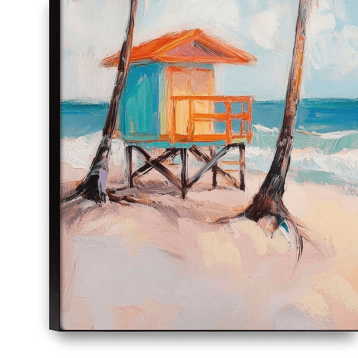 A tropical paradise unfolds with gentle waves playing on the shore and the breeze blowing through the majestic palm trees. The vibrant, orange-coloured lifeguard tower shines on the soft sand, while the sky glows in brilliant shades of blue and white. Here, tranquillity and adventure merge to create an unmistakable coastal feeling.