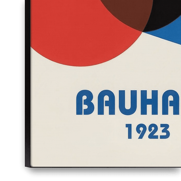 The work shows three overlapping circles in red, brown and yellow on a cream-coloured background with diagonal blue stripes. Below the shapes is the lettering "BAUHAUS 1923" in blue letters. The composition combines clear geometry, reduced areas of colour and typographic rigour in the style of Bauhaus aesthetics. It reflects the design…