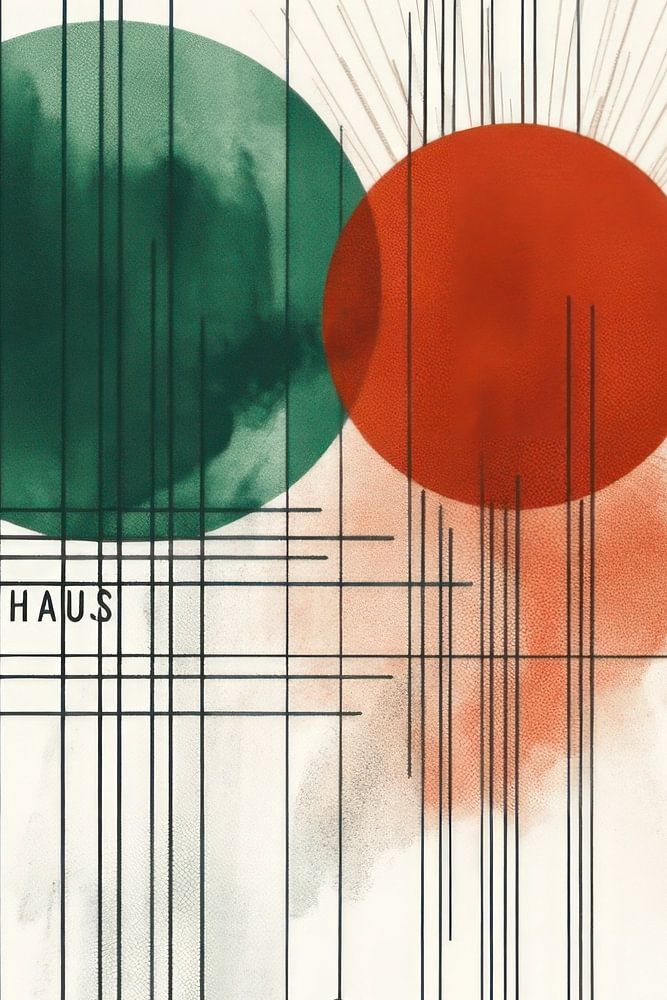 A trendy Bauhaus design poster for the wall in a stylish interior that combines minimalist, geometric shapes and clean lines with vibrant colours such as red, yellow, blue and black. The poster is characterised by a playful yet balanced composition of circles, triangles and rectangles, overlapping and placed in perfect harmony. The design combines symmetry and asymmetry in a dynamic way, which is typical of the Bauhaus style, balancing functionality and aesthetics.