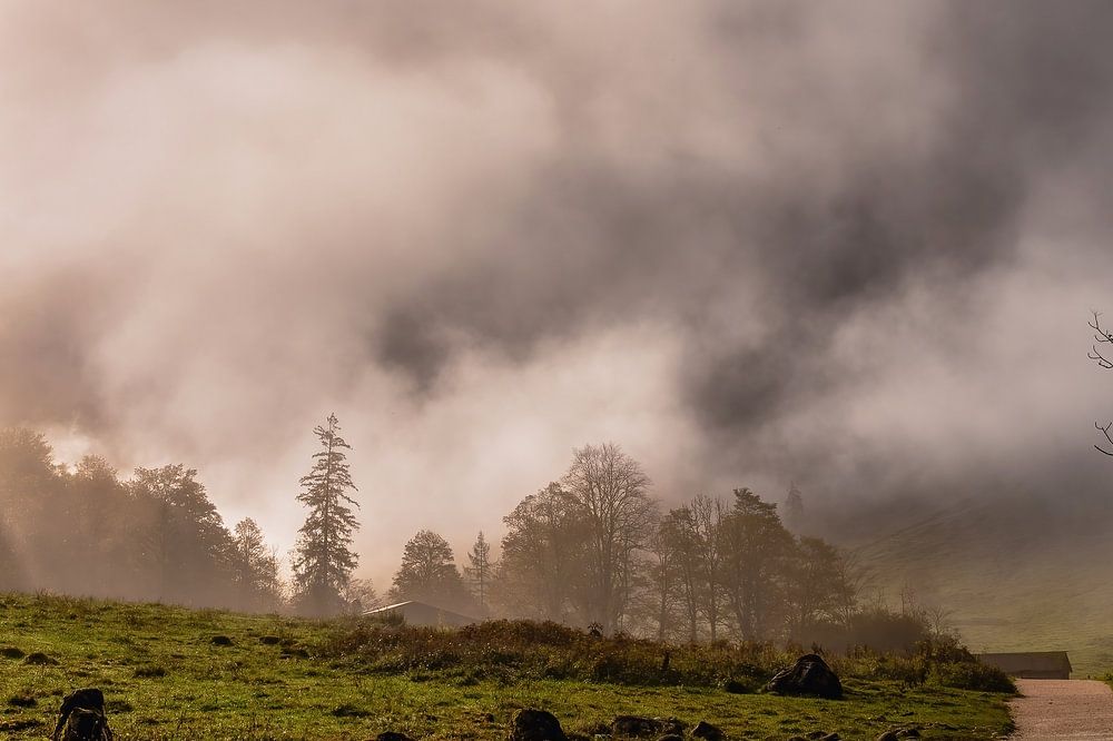 Landscape in national park Berchtesgaden, a huge nature reserve in Berchtesgaden, Bavaria in Germany. It is misty and the rising sun is doing its best to break through.