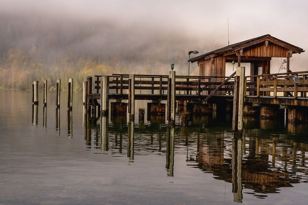 Landscape at Königssee, a huge lake located in Shönau am Königssee, Bavaria in Germany. You can see the jetty in the mist.