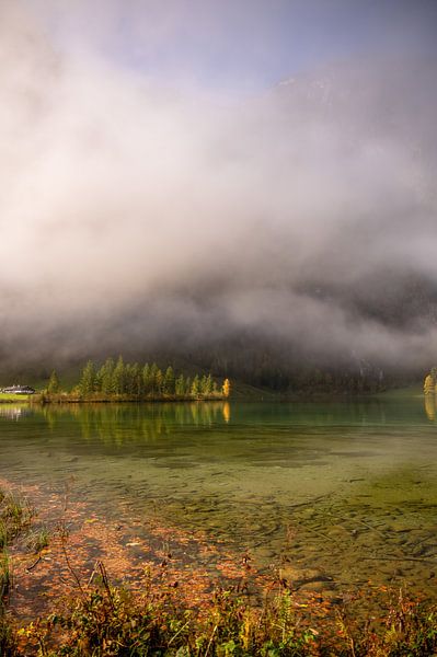 Landscape at Königssee, a huge lake located in Shönau am Königssee, Bavaria in Germany. Low-hanging clouds hang over the water and the trees show beautiful autumn colours.