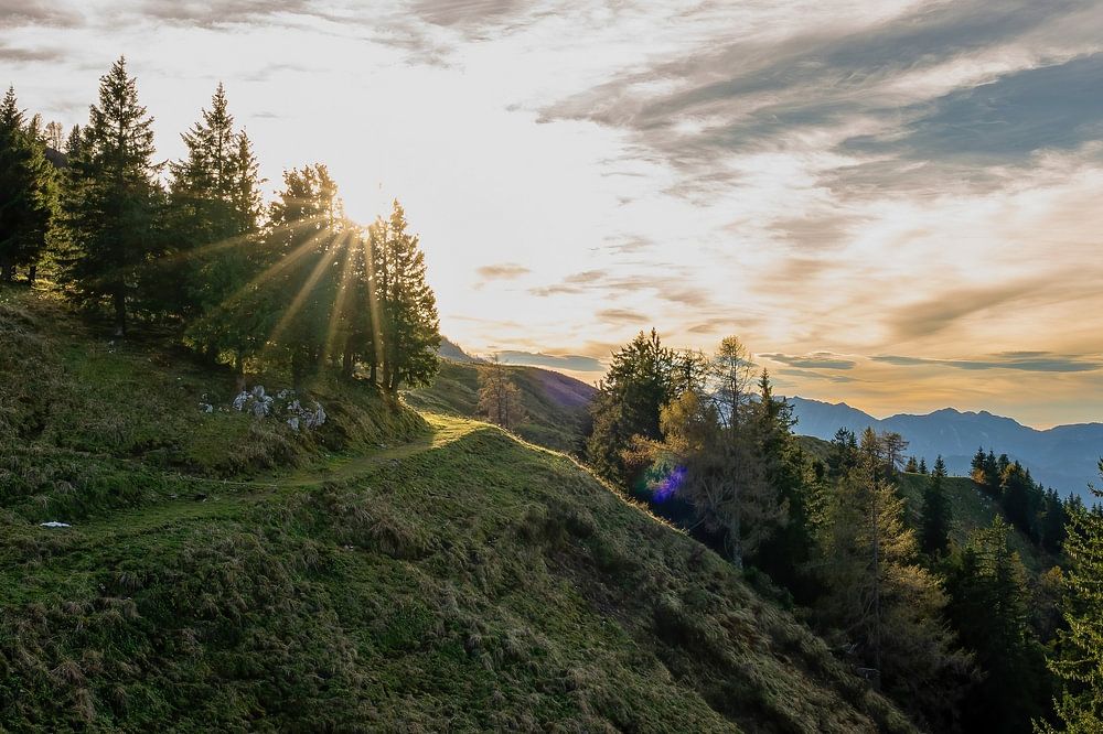 Landscape on the panorama strasse, a tourist route in the mountains of Berchtesgaden, during autumn. The sun is setting, colouring the sky in warm hues.