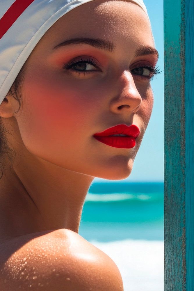 Amidst the bright blue sky and the gentle sound of the sea, a young beauty with a nostalgic red and white striped headscarf shines. Her bright lips and alert gaze create a harmonious connection to the maritime backdrop, while the cool blue of the wall provides a vivid contrast to her warm complexion. A moment of pure elegance on the beach.