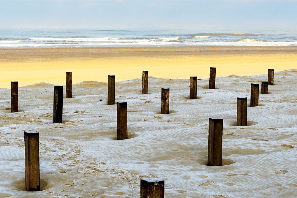 A nice atmosphere with the morning sun and warm light over the beach and dunes. A feeling of let the day come. Lovely walks along the beach and through the dunes, alone with your thoughts. A warm and at the same time fresh feeling. The posts give a somewhat abstract image into the room, the build-up in the photo gives depth. Your gaze moves over the sand with all the details in it of animals and people towards the golden yellow sand and then the blue sea.