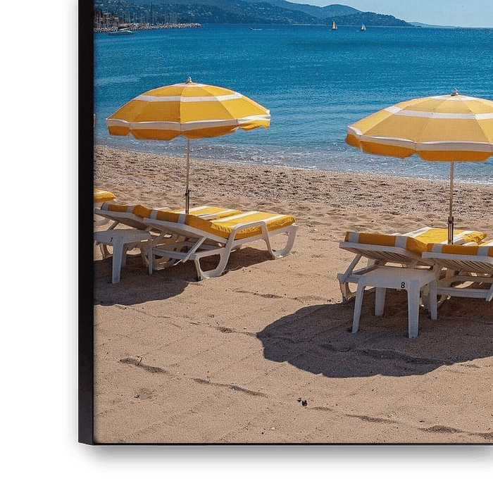 Buy the photo Beach chairs with yellow parasols on the beach, the sun glistens on the sea, Le Lavandou, Var, Franc by Rene van der Meer on canvas, ArtFrame, poster and wallpaper, printed on demand in high quality.