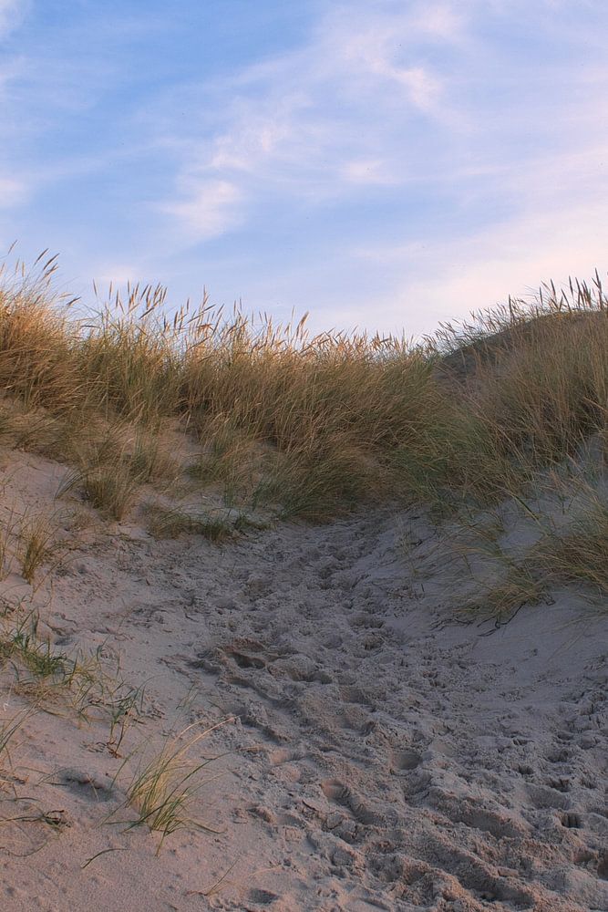 Beach crossing between dunes on the coast of Denmark. Landscape photograph in Denmark