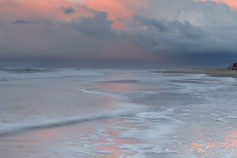 Beachhouse on stilts on the beach near Petten The Netherlands. The sunset and long shutter time make for a nice image.