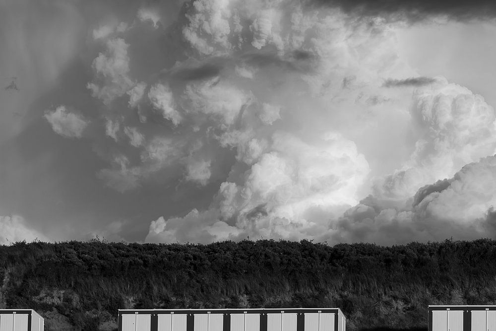 Threatening clouds during a walk on the Banjaard beach on North Beveland. A strong wind chased the sand across the beach while the beach houses in front of the dunes were the silent witnesses of better weather. An ideal subject for a black-and-white photo.