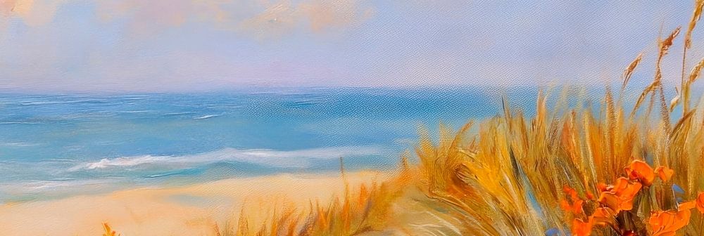 Soft sandy beaches blend harmoniously into a picturesque coastal landscape, while gentle waves kiss the shore. The bright colours of the flowers contrast with the warm earthy tones of the beach, while the sky shimmers in pastel shades. A feeling of tranquillity and unspoilt nature envelops this idyllic scene.