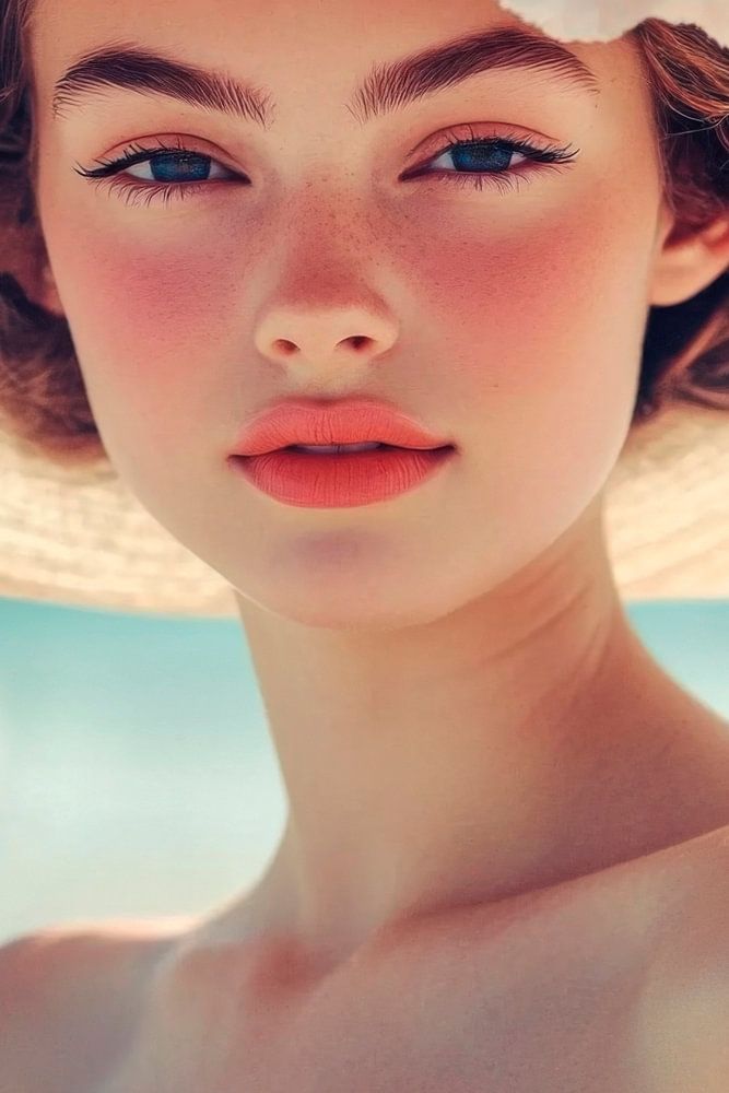 Summery elegance radiates from the gentle features of a girl whose face is enveloped in soft sunlight. The wide, white hat with a flowery appliqué and the striped outfit give her a fresh, maritime charm. Her bright eyes and gentle expression capture the lightness of carefree days at the beach.