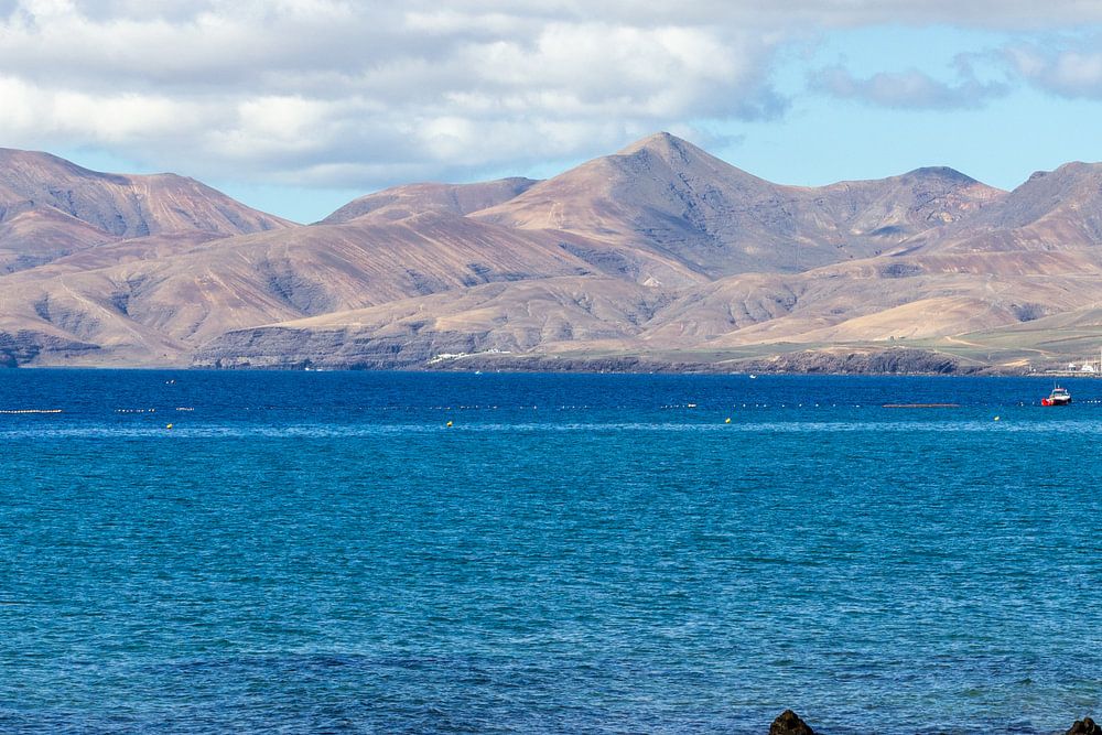 Beach of Puerto del Carmen on the Canary Island Lanzarote with sand, stones and blue water in the foreground, white houses, palm trees and volcanic mountains in different colours in the background
