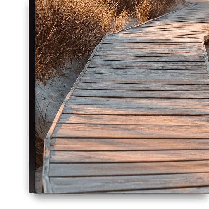 An inviting wooden walkway winds its way through golden beach grass and leads gently to the glistening ocean. The soft light of the evening sun bathes the scenery in warm tones, while the sound of the waves hums softly in the distance. Here, nature and tranquillity merge into a perfect moment that invites you to linger.