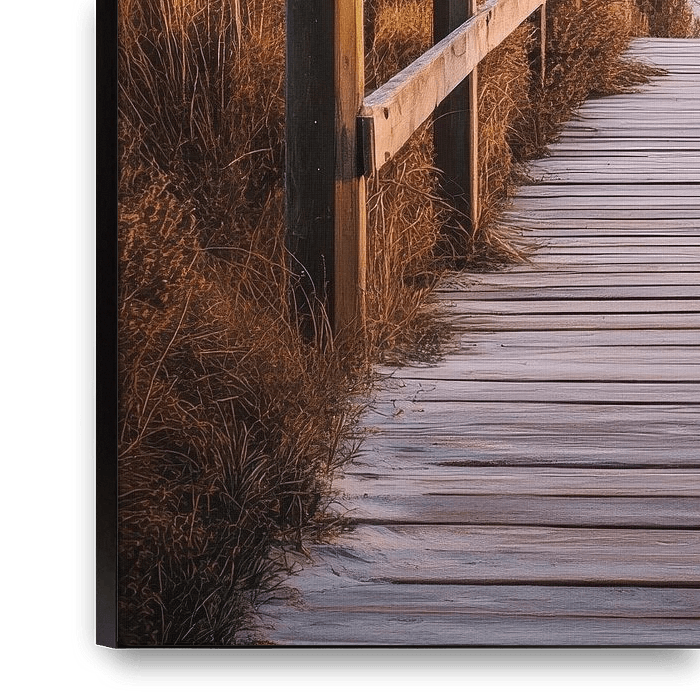 An enchanted wooden plank path winds its way through gentle grass and leads directly to the glistening coastline. The sky glows in soft pastel colours, while the gentle waves quietly come to rest. This image conveys the promise of a peaceful moment by the sea, where nature and tranquillity merge harmoniously.