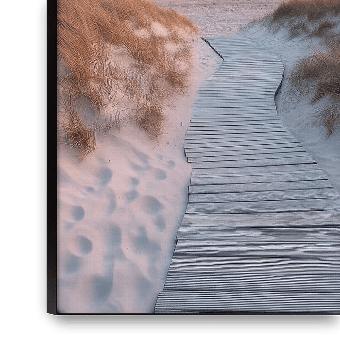 An enchanted wooden path winds its way through gentle dunes. Golden grasses sway in the gentle wind, while soft clouds colour the sky in pastel shades. The ocean glistens in the distance and invites you to dream, where the day dawns with new possibilities and the tranquillity of nature enchants.