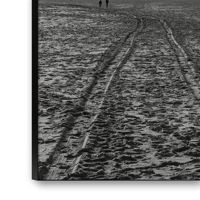 The beach road to Europoort is a black and white landscape photograph taken from the beach at Kijkduin. The image shows a vehicle track in the sand of the beach forming a road towards the port of Rotterdam, or Europoort. This photo was taken in the winter so the warm exhaust fumes from the harbour are very visible in the air. In the distance you can see the large cranes at the Europoort Euromax terminal loading and unloading the heavy containers. On the beach there are some people walking in the distance.