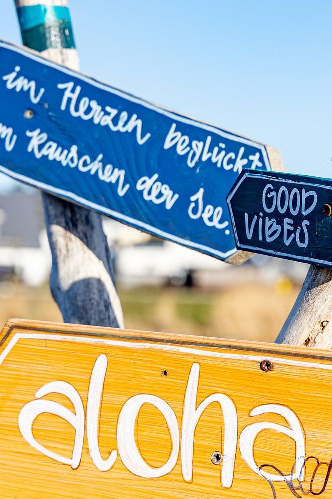This cheerful picture shows a collection of hand-painted signs on a beach. With messages such as "Vitamin SEA", "delighted at heart by the sound of the sea", "GOOD VIBES" and "aloha", the image conveys a relaxed and positive atmosphere. Perfect for lovers of beach holidays and those who appreciate a pinch of sea breeze in their everyday life. This shot invites you to enjoy the good vibes and the beauty of the sea.