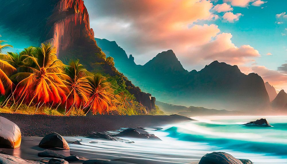 Buy this landscape artwork Beach with waves and landscape by Mustafa Kurnaz on canvas, ArtFrame, poster and wallpaper, printed on demand in high quality.
