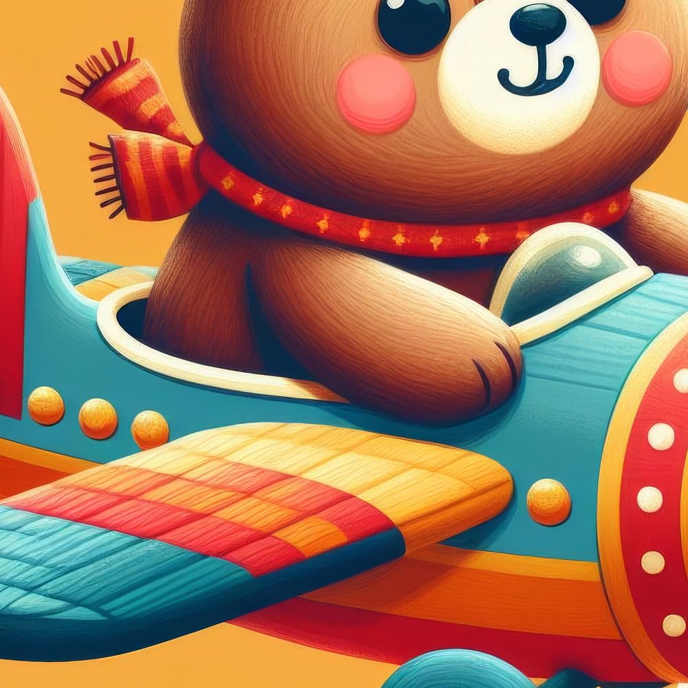 The image depicts an adorable cartoon bear piloting a colorful toy airplane. The bear, with its soft brown fur, rosy cheeks, and a friendly smile, wears a blue pilot's hat with a gold star and a red and yellow scarf. It sits in the open cockpit of the plane, its paws gripping the controls. The plane itself is brightly colored with red, yellow, and blue stripes, and a spinning propeller. It soars through a whimsical sky filled with fluffy white clouds against a warm, golden background. The overall impression is one of childlike wonder and the joy of adventure.