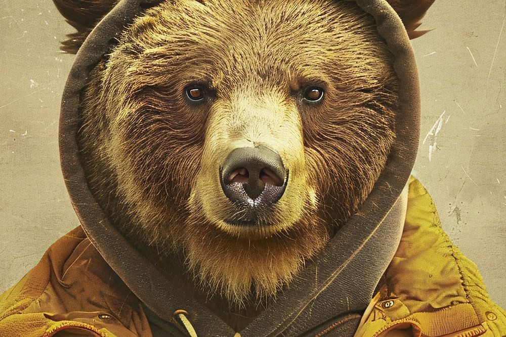 This unique artwork combines the power of nature with modern fashion, dressing a realistically rendered bear in a fashionable coat and hoodie. The image's sepia tones and vintage style give it a timeless appeal, perfect for those looking for an intriguing and eye-catching piece for the home or office. The design raises questions and invites conversation, while adding warmth and humour to the space. A great choice for lovers of both animals and art with a twist.