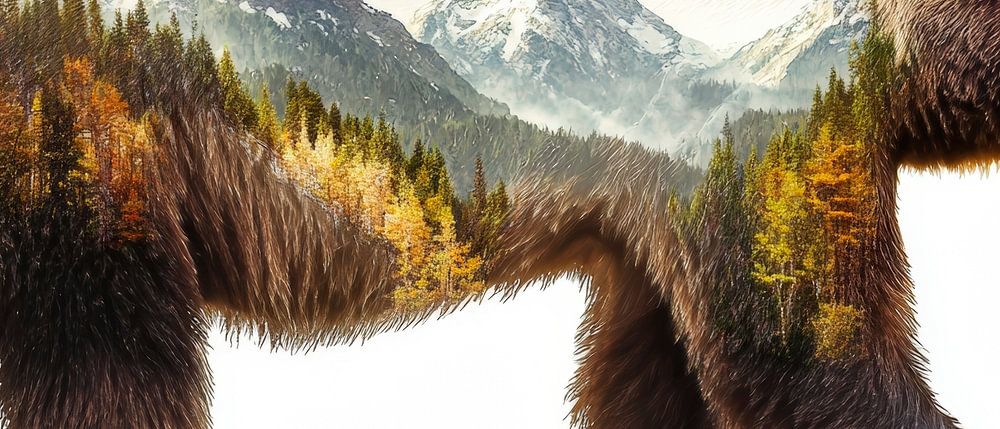 A majestic bear whose body is filled with an impressive landscape of mountains and forests conveys a feeling of freedom and closeness to nature. This work of art is perfect for the living room, where it brings the tranquillity and beauty of the wilderness into your home and invites you to dream.