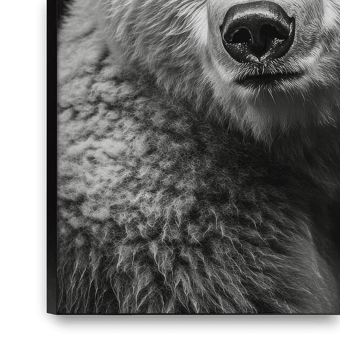 A majestic brown bear with bright eyes and a gentle, inviting presence immediately captures the attention. Its soft, spotted fur adds texture to the image, while the monochrome depiction evokes timeless elegance. This impressive work of art is perfect for a living room, where it can stimulate conversation and attract curious glances.