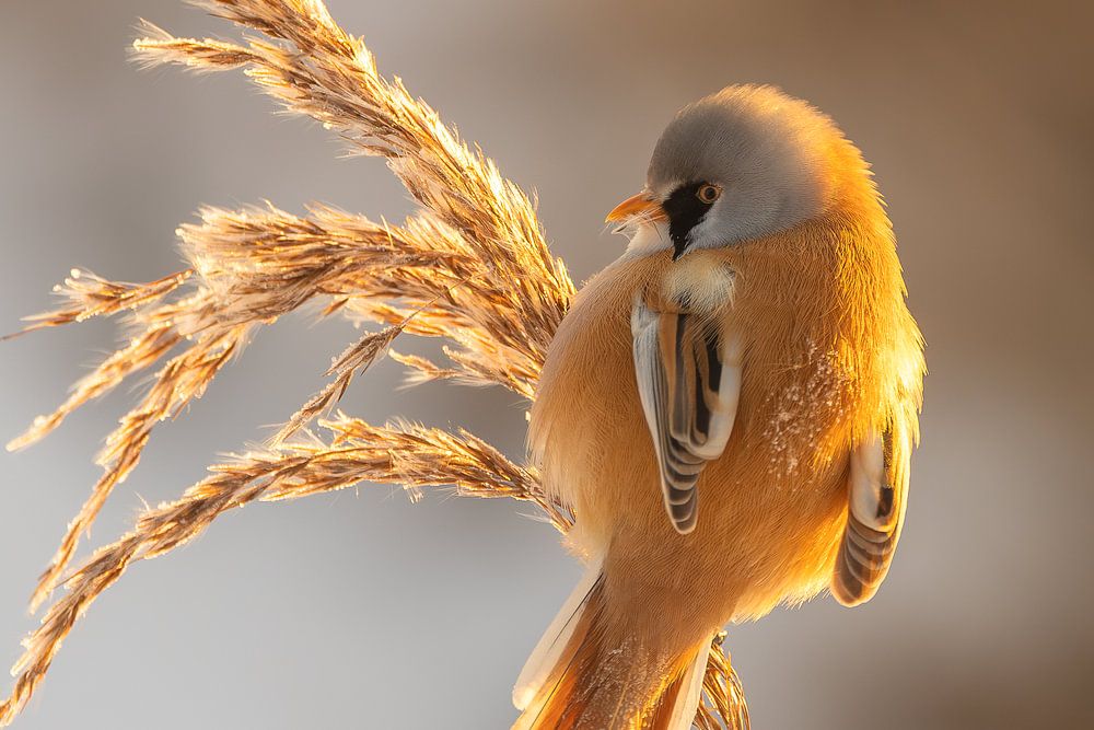 Buy this bird art Bearded Reedling in winter morning sunshine by Neil Kampherbeek on canvas, ArtFrame, poster and wallpaper, printed on demand in high quality.